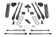 Fabtech?s 6" 4 Link Conversion system for the Ford F450 and F550 Super Duty is built to handle the on and offroad demands of the truck enthusiast. This vehicle?s suspension is more robust than the Ford F250 and F350 and therefore demands specialty parts only available from Fabtech. This system comes with everything needed to convert to a 4 Link front suspension. The system will provide less caster change throughout the travel range which benefits on road driving. Offroad the 4 Link system will provide more articulation than a Radius Arm for increased terrain traversing at all speeds. Fabtech?s 4 Link System has been proven in over 10 years of service in consumer, commercial and military applications. High quality components with properly design suspension geometry is the pinnacle of Super Duty suspension systems. Each Fabtech component is expertly built in house and has specific design features and benefits as listed below. FEATURES: LINK ARMS & BRACKETS - 2" OD Heavy wall link arms have 1/4" thick steel brackets at the axle with adjustable alignment cams and Fabtech?s legendary 5 Ton joints? to pivot at the frame for an extended service life. The 5 Ton joints? have been proven in military use for over 10 years and are quiet and strong. The 4 Link Arms attach to stout 1/4" thick steel frame brackets for a solid mounting of the new suspension. The geometry of the 4 Link arms and frame brackets has been designed to provide an improved highway ride due to reduced caster change and able to tackle rough offroad conditions better than a Radius Arm suspension. COIL SPRINGS - American made coil springs have been designed for a very compliant ride quality both on and offroad. Each coil is preset during the manufacturing process to insure no ride height settling over time. Allows for a 2" increase in wheel travel over stock when used with Fabtech shock absorbers. TRACK BAR BRACKET - 1/4" thick steel bracketry rep-ositions the factory track bar to center the axle under